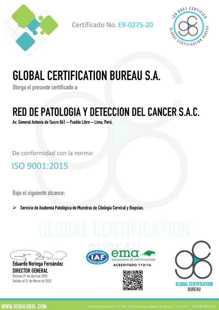 Nuestro laboratorio se encuentra certificado por el GLOBAL CERTIFICATION BUREAU con el ISO 9001 de gestión de calidad.